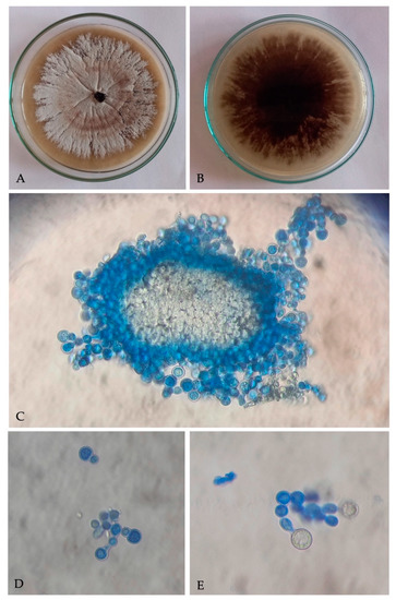 - White, T.J.; Bruns, T.; Lee, S.; Taylor, J. Amplification and direct sequencing of fungal ribosomal RNA genes for Phylogenetic. In PCR Protocols: A Guide to Methods and Applications; Innis, M.A., Gelfand, D.H., Sninsky, J.J., White, T.J., Eds.; Academic Press: New York, NY, USA, 1990; pp. 1–315. [Google Scholar]