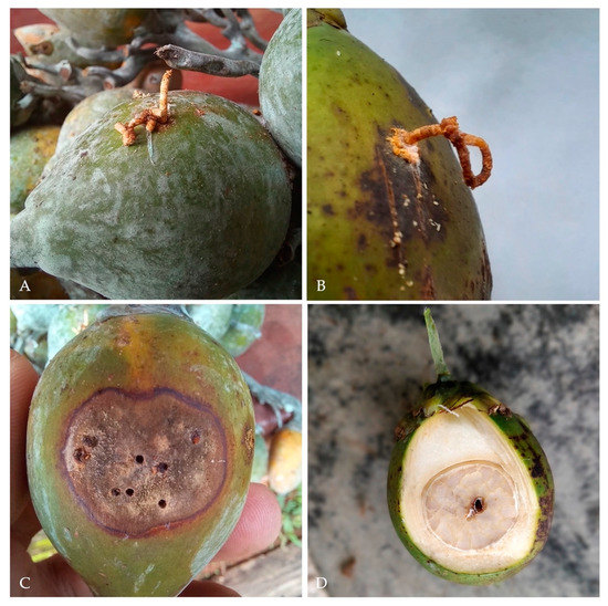 Areca nuts showing symptoms of the attack by Xylosandrus crassiusculus. (A,B) nut showing the typical frass noodle produced by the boring activity of the beetle; (C) nut presenting multiple entrance holes in association to a dark staining of the exocarp; (D) longitudinal section illustrating one Xylosandrus crassiusculus piercing through the nut kernel.
