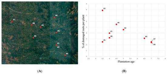 (A) Map of the plantations presenting damages caused by X. crassiusculus, numbered following the order given in Table 1; (B) Plot illustrating the percentage of the damaged nuts on infested plants in association with the age of the areca palm plantation.