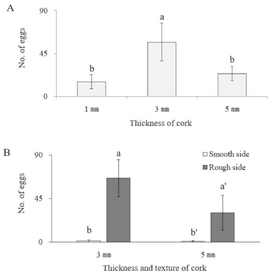 We examined both the thickness and the texture of a cross-section of cork sheets—selected as a substitute for live plants—using the choice test. To examine thickness, 1-mm, 3-mm, and 5-mm thick cork pieces were cut from a 5-cm × 0.5-cm corkboard (E712, E612, E912, Bluewin Co., Ltd., Paju, Korea). The cork pieces and five pairs of adults (10 days post emergence) were placed in the breeding dish (10 cm diameter, 4 cm height, 310102, SPL Life Science Co., Ltd., Pocheon, Korea) with a ventilation mesh (4 cm diameter) on the lid. The number of eggs was observed under a microscope (Dimis-ME, SIWON, Anyang, Korea) after 24 h. In total, 60 pairs of adults were used in each experiment.