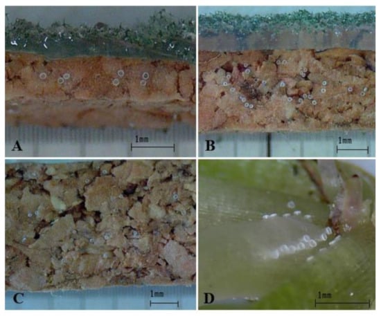 Eggs of Orius minutus on rough cork substrates of different thickness ((A) 1 mm, (B) 3 mm, (C) 5 mm) and eggs on plant substrate (D).