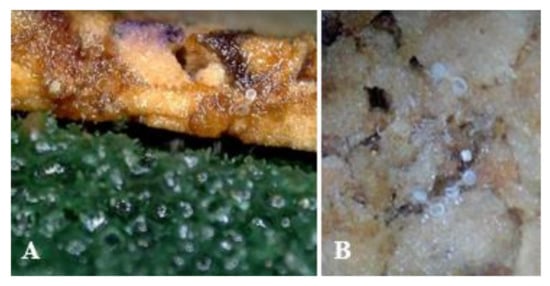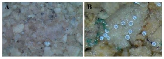 Smooth cork substrate without eggs of Orius minutus (A) and rough cork substrate with eggs (B).