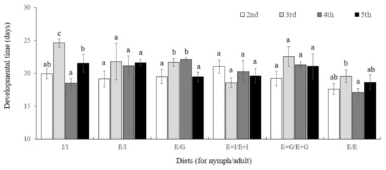 The results of analyzing the growth period by feeding six different diet combinations and breeding them continuously for five generations are shown in the Figure 5. In each treatment group, although a slight difference was observed in the developmental time according to the diet source and generation (I/I: df = 4,10, F = 2.71, p = 0.0915; E/I: df = 4,10, F = 9.96, p = 0.0016; E/G: df = 4,10, F = 11.45, p = 0.0009; I+E/I+E: df = 4,10, F = 4.65, p = 0.0222; G+E/G+E: df = 4,10, F = 22.69, p < 0.0001), as a result of a two-way analysis, no statistically significant difference was identified (diet source: df = 5,48, F = 0.92, p = 0.4788; generation: df = 3,48, F = 1.34, p = 0.2721; diet source × generation: df = 15,48, F = 0.84, p = 0.6011).