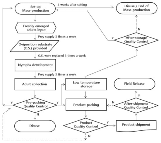 Flow chart of mass-rearing of Orius minutus. Y means passing the quality control result, and n means failing the quality control result.