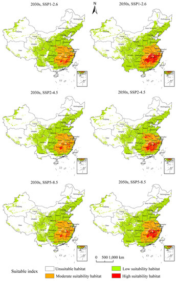 - Yan, Y.; Wang, Y.; Feng, C.; Wan, P.M.; Chang, K.T. Potential Distributional Changes of Invasive Crop Pest Species Associated with Global Climate Change. Appl. Geogr. 2019, 82, 83–92. [Google Scholar] [CrossRef]