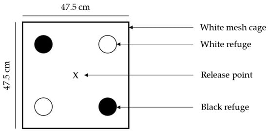 Schematic diagram showing the arrangement within each mesh cage for the refuge colour (dark vs. light) experiment. Refuge positions are shown in circles and the vine weevil release point using an x mark.