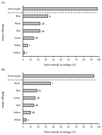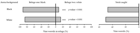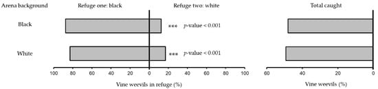 For weevil species where research has been completed, visual cues are known to be important in the location of hosts and conspecifics [,,]. Little research on the behavioural responses of adult vine weevil to visual stimuli has, however, been carried out to date. This study tests whether the behavioural responses of vine weevil adults towards prototype refuges under laboratory conditions are influenced by visual stimuli such as refuge colour, size and entrance location.