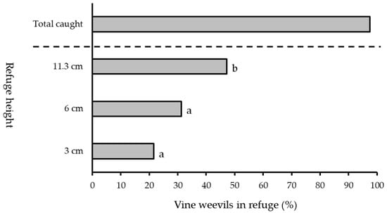 Percentage of vine weevil adults recorded in refuges with a height of 3, 6 or 11.30 cm when released as a group of ten individuals (number of replicate days = 5). Different letters denote significant differences between means (p < 0.05).