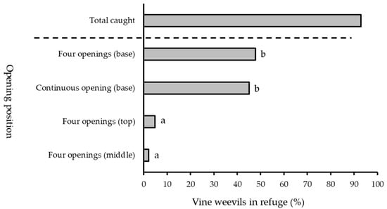 Percentage of vine weevil adults recorded in refuges with openings on the side, top or base—continuous opening or four openings—when released as a group of ten individuals (number of replicate days = 5). Different letters denote significant differences between means (p < 0.05).