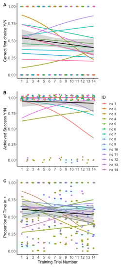 Measurements of training trial success for Experiment 1—Within modality ‘sameness’ assay. (A) Likelihood of the focal amblypygid first entering into the C+ region from the neutral area. Individuals did not improve their first choice performance during training. (B) Likelihood of entering the C+ door in the 20 min time limit (successful training trial). Individuals did not improve in proportion of successful trials over time. (C) Proportion of time spent in C+ area out of total time spent outside the neutral zone. A value of 0.5 indicates equal time in the C+ and C− areas of the arena. Individuals did not increase the proportion of time spent associating with the C+ stimulus.