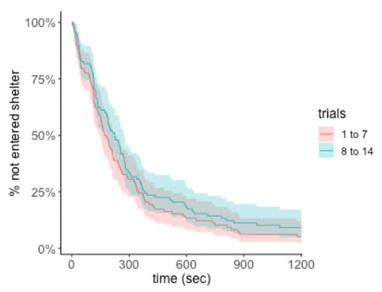 Cox proportional-hazards model of time to success for Experiment 1—Within modality ‘sameness’ assay. Survival curves for time to enter correct shelter with 95% confidence intervals. Curves represent early trials (1 to 7) and late trials (8 to 14). Trials were completed at 1200 s.