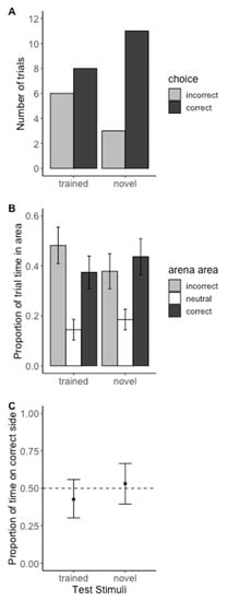 Test trial results from Experiment 1—within modality ‘sameness’ assay. (A) Barplot of initial choice in two-choice tests. The initial choice for trained stimuli tests (X-squared = 0.28571, df = 1, p-value = 0.593) and the initial choice for novel stimuli tests (X-squared = 4.5714, df = 1, p-value = 0.03251) were not statistically different. (B) Average proportion of time spent in each area of the arena during test trials with standard error bars. (C) Modeled estimates and their 95% confidence intervals of the proportion of time spent in front of C+ door (excludes neutral zone). A value of 0.5 represents an equal amount of time spent in front of both doors. Phrynus marginemaculatus did not spend significantly more time in front of the C+ door, suggesting they did not learn the concept of ‘same’.