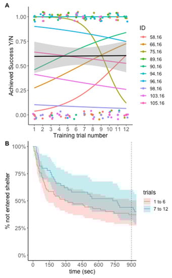 We also find it important to note that many of the previously discussed learning experiments in other taxa require test subjects to exhibit a threshold level of learning during training trials before proceeding to subsequent test trials []. Unfortunately, given our small sample sizes, we were unable to disqualify any individuals from the test trials. We did, however, observe a large amount of individual variation (Figure 2 and Figure 5) that could be due a range of factors including variation in motivation to seek shelter, variation in exploratory behavior, or variation in learning ability itself (as seen in goats []). Without a larger sample size, we are unable to determine which of these factors was likely responsible for the individual-level variation we encountered, but future studies should explore these differences.