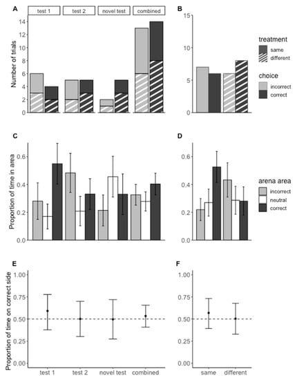 The test subjects did not spend more time on the correct side of the arena versus the incorrect side on average (Figure 6C,D) (Figure 6E,F; test 1 mean = 0.59, 95% CI = (0.38, 0.78); test 2 mean = 0.51, 95% CI = (0.30, 0.70)); novel test mean = 0.50, 95% CI = (0.27, 0.72); combined mean = 0.53, 95% CI = (0.41, 0.66); same mean = 0.57, 95% CI = (0.39, 0.73); different mean = 0.50, 95% CI = (0.33, 0.68).