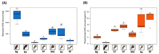 Another important but often-neglected factor in CHC studies is the consideration of different insect body sizes when assessing total CHC amounts. Insect body sizes translate to their respective surface areas, which in turn can influence total CHC quantities and distributions across the insect body [32,62]. Moreover, the primary function of CHCs is the prevention of desiccation, where the insects’ body surface also plays a major role [8,33,34]. Nevertheless, insect body surface areas are rarely considered in CHC studies, particularly when comparing overall CHC amounts (e.g., [29,30,31]). Therefore, we calculated proportional CHC amounts, factoring in the largely variant body surface areas of our studied Blattodea species, and compared them to unadjusted extracted CHC amounts. Our results highlight different proportional distributions between the two assessment methods, indicating that extracted CHC amounts alone may not always reflect accurate CHC quantity ratios without considering body surface areas. Since our overall sample size is rather limited to draw more general conclusions, it may be useful to factor in body surface areas in future studies investigating overall CHC quantities, especially when comparing insects with very divergent body sizes. This might also prove particularly useful in studies assessing differences in desiccation resistance, as body surface areas also likely constitute an important additional factor here. Furthermore, as our study clearly demonstrates, GC-MS assessed CHC quantities do not always include the entire CHC compound range present on the insect cuticle. This potentially further restricts the validity of quantitative comparisons between solely GC-MS assessed CHC amounts. Clearly, reliable quantification techniques of compounds beyond the GC-MS accessible range will be necessary for a holistic assessment of the whole CHC repertoire. However, other factors such as cuticle thickness, degree of sclerotization or morphological structures such as hairs also potentially influence both overall CHC amounts, as well as body surface areas, and should also be considered in future studies [63,64,65].