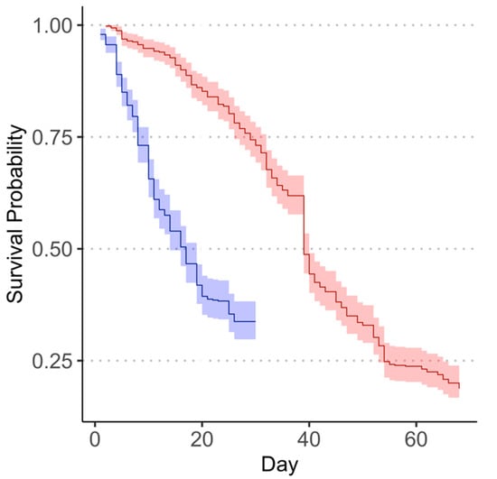 Survival curve showing differences in the instantaneous survival probability between the August (blue) and September (red) collections. Shaded areas represent 95% confidence intervals. Day zero represents the application of chemical treatments.