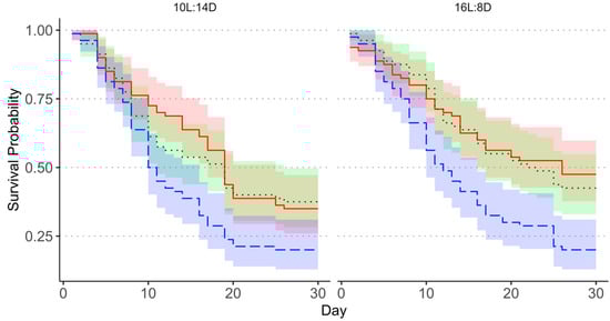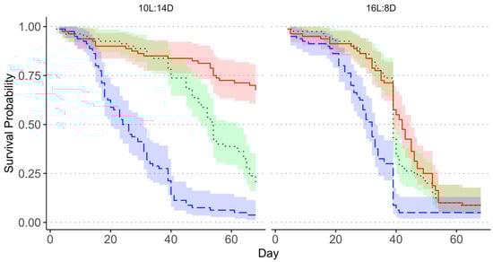 Survival curve for the September collection showing differences in the instantaneous survival probability between the acetone (red solid line), 1.0% pyriproxyfen (blue dashed line), and 0.1% pyriproxyfen (green dotted line), separated by photoperiod treatment. Shaded areas represent 95% confidence intervals.