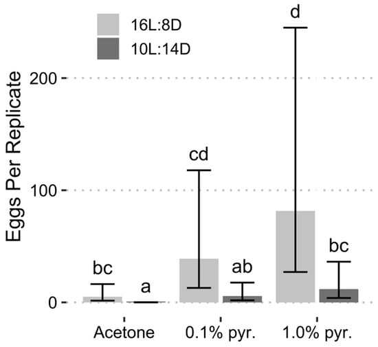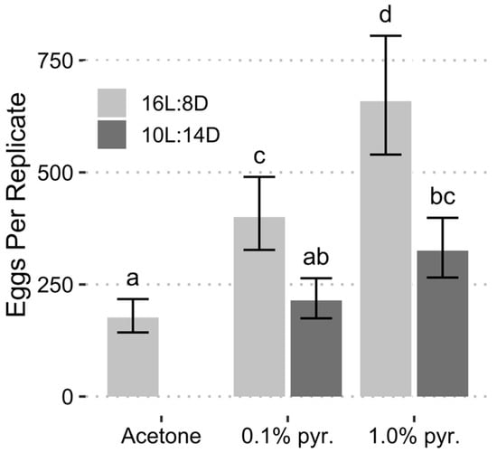Egg production separated by chemical treatment (pyr. = pyriproxyfen) and photoperiod from the August collection. Error bars represent 95% confidence intervals. Bars with the same letter are not significantly different (α = 0.05, estimated marginal means with Tukey’s method of adjustment for multiple comparisons).