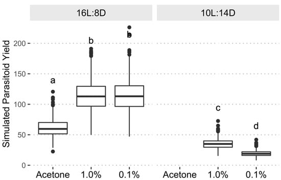 Estimated parasitoid yield from bootstrap simulations (n = 2000) using model estimates of egg production and parasitoid viability. The long-day photoperiod significantly increased parasitoid yield over short-day treatments, while within the long-day photoperiod the pyriproxyfen treatments produced similar parasitoid yields and yielded significantly more parasitoids than the acetone treatment. Boxplots with the same letter are not significantly different (α = 0.05, estimated marginal means with Tukey’s method of adjustment for multiple comparisons).