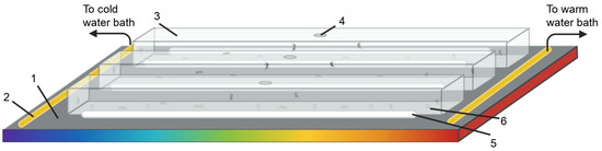 Schematic of the thermal gradient experimental setup. A temperature gradient was created on an aluminum plate (1) using a cold and a warm water bath on either side, connected with copper tubing (2). The mosquitoes were released into acrylic covers (3) through a hole in the top with a fitted acrylic plug (4). Each cover had moist wipe towels (5) and holes drilled on each side to minimize humidity build up (6). The acrylic enclosures are open on their bottom side to allow direct contact of mosquitoes with the aluminum plate.