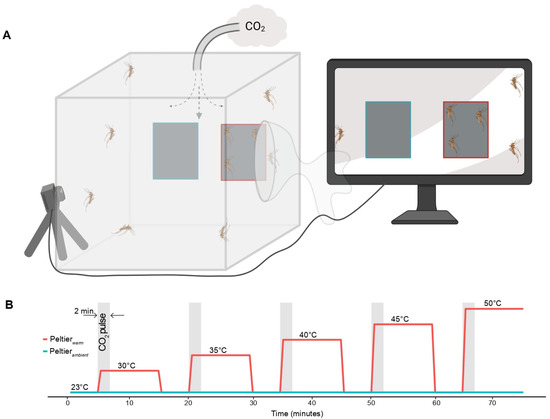 The heat and CO2 seeking assay was performed based on methods adapted from previous studies [11,12]. The setup consisted of a mosquito rearing cage (Rearing and Observation Cage, 12” cube, Bioquip) with two Peltier elements (6 × 4 cm surface area; 12 V 5 A, Peltier Thermo-Electric Cooler Module and Heatsink Assembly, Part # 1335, Adafruit, New Your, NY, USA) equidistantly placed against the mesh lining one of the vertical walls of the cage. A 2 × 2 cm black square printed on standard printer paper (bright white, letter size; Gemini/Liberty paper, Los Angeles, CA, USA) placed at the center of both the Peltier elements served as a visual cue, which has been shown to enhance attraction for warm surfaces in Aedes mosquitoes [12,14] (Figure 2A). At the beginning of each 75 min long trial, 15 female mosquitoes were released into the cage and allowed to acclimate for 5 min. During acclimation, both Peltier elements were maintained at ambient temperature (23 °C). Post acclimation, one of the Peltier elements (Peltierwarm), chosen at random, was warmed up to deliver an increasing sequence of thermal stimuli between 30 and 50 °C with a 5 °C difference between successive stimuli, i.e., 30, 35, 40, 45, and 50 °C. The sequence of thermal stimuli in the assay was not randomized as exposure to higher temperatures in the initial phase of the assay might affect mosquitoes’ subsequent responses towards thermal stimuli at lower temperatures. Each of these thermal stimuli lasted for 10 min, following which the Peltier was cooled to ambient temperature for 5 min (Figure 2B). A humidified air stream (6.80 m/s) was delivered into the cage from the center of its top side throughout the duration of the assay. A CO2 pulse (2100 ppm or 30,000 ppm; 0.8 m/s, Gasco, Oldsmar, FL, USA) lasting 2 min accompanied the onset of each thermal stimulus and was injected into the humidified air circuit (Figure 2A). The other Peltier element (Peltierambient) was maintained at ambient temperature throughout the trial. The surface temperatures were monitored using a thermal imaging camera (C3, FLIR Systems, Wilsonville, OR, USA) and precisely controlled via a custom-built Arduino PID controller (Arduino Uno R3; Monster Moto Shield VNH2SP30). The circuit diagram and code for the PID controller used in this assay are available online (https://github.com/mosquito-hub/Culex-Thermal-Biology.git, accessed on 10 January 2022). Gloves were used to release mosquitoes into the experimental setup to avoid contamination with host odors, and the experiment was triggered and controlled remotely to prevent interference from the experimenter. Mosquitoes were attracted to the Peltier surface as well as the adjacent surfaces, perhaps owing to heat dissipation and convective currents. To account for attraction elicited by the dissipated heat, a target region (9 × 9 cm) around each of the Peltier elements was defined within which the number of mosquitoes that landed every 30 s throughout the trial was quantified by manually transcribing the videos.