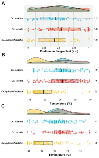 Thermopreference in Culex mosquitoes. (A). Mosquito distribution (bottom) on the aluminum plate set at 25 °C (i.e., constant temperature, control) and corresponding density plot (top). (B). Mosquito distribution (bottom) on the low temperature gradient (bottom) and corresponding density plot (top). (C). Mosquito distribution (bottom) on the high temperature gradient (bottom) and corresponding density plot (top). The density plots summarize the mosquitoes’ distribution along the gradient. Each dot represents the final resting position (i.e., Tp) of a single female mosquito. The boxes represent the upper and lower quartiles, and the black bars indicate the mean of each group. n.s. denotes mosquito distributions in the constant gradient experiments that were not significantly different from a uniform, continuous distribution (Kolmogorov–Smirnov tests, α = 0.05). Letters denote statistical differences between groups (Tukey post hoc tests for multiple comparisons, adjusted α = 0.05). Four replicates (n = 10; N = 40) have been used for the constant gradient. Ten replicates (n = 10, N = 100) per species have been used for the low and high gradients.