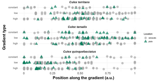 Proportion of mosquitoes resting on the aluminum plate (i.e., “plate”, green triangle) and on the side of the covers (i.e., “sidewalls”, grey circle) for each of the temperature gradients and mosquito species tested. Four replicates (n = 10; N = 40) have been used for the constant gradient. Ten replicates (n = 10; N = 100) per species have been used for the low and high gradients.