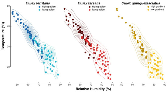 A 2-D density plot representing the temperature and humidity at the final resting position of the three Culex mosquito species on the gradients. Each dot represents a single mosquito. Low and high gradient data are highlighted in light and dark shades, respectively. Ten replicates (n = 10; N = 100) per condition per species have been used.