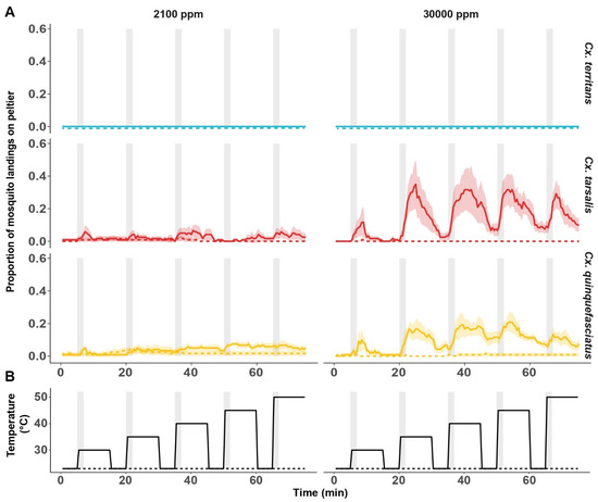 Heat seeking of Culex mosquitoes exposed to pulsed CO2 at low or high concentrations. (A). Mean proportion of mosquito landings on the ambient (23 °C; dashed line) and warm (30–50 °C; solid line) Peltier elements in the presence and absence of CO2 at concentrations of 2100 ppm (left) and 30,000 ppm (right). The shaded region around the mean denotes the 95% confidence interval. (B). Schematic representation of Peltier elements’ temperatures, both ambient (dashed line) and warm (solid line), as a function of time in the heat-seeking assay. Vertical gray bars denote the 2-min CO2 pulses that accompanied the thermal stimuli in the assay. Eight replicates (n = 15) per condition per species have been used.