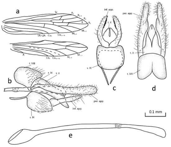 Description: Specimens were in alcohol, with compound eyes black, wings pale brown, legs yellowish brown. Fore- and hind wings are with patches of scaloid setae. Each of the forewings (Figure 1a) has a length of 2.5–2.6 mm (n = 2); venation is typical of the genus, but Sc is extended beyond the bifurcation of Rs, fork II sessile. Hind wings are 2.1–2.2 mm long (n = 2), the venation is typical of the genus, but crossvein r m originating at the bifurcation of fork II. Spurs: 0-4-3.