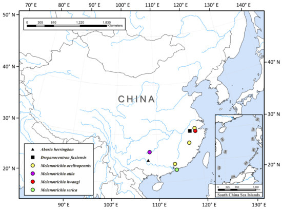 The existing records [8,11] showed that China has recognized only three species in the genus Melanotrichia, which are distributed in the Oriental region. The spread of Melanotrichia on the Asian continent may have been hindered by the topography of the Qin-ling Mountains and Huai-he River. This could be a reason why a total of three species of the East Palearctic region in the Melanotrichia genus, all distributed in Japan, have no record in the vast Chinese East Palearctic area. In addition, the collection efforts in the northern part of China are not as good as those in the south, which may have limited our knowledge of the actual distribution of Xiphocentronidae.