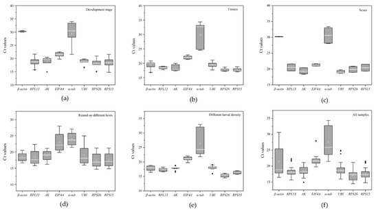 Box-whisker plots of expression patterns of candidate reference genes under different conditions. (a) Developmental stages. (b) Different tissues. (c) Gender. (d) Larvae feeding on different hosts. (e) Different larval densities. (f) All samples. The white line denotes the median in the box. The interquartile range is denoted by the upper and lower edges, which represent the 75th and 25th percentiles. The whisker caps on each box represent the maximum and minimum values.