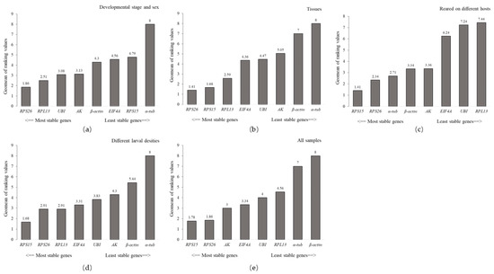 The stability of the eight candidate reference genes was evaluated by the RefFinder. (a) Developmental stages and gender. (b) Different tissues. (c) Larva feeding on different hosts. (d) Different larval densities. (e) All samples.
