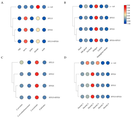 β-actin and α-tub were often selected as internal reference genes. For example, actin was the most stable reference gene in development stages, different tissues, and sex of Diaphania caesalis [46]. In C. bowringi Baly [36], actin was used to normalize target gene expressions in the tissues of female adults. In experiments with the Antheraea pernyi infected by multicapsid nucleopolyhedrovirus, actin and α-tub were suitable reference genes for normalizing qRT-PCR data [45]. However, under certain conditions, β-actin and α-tub were unstable as reference genes. In our research, β-actin and α-tub showed instability in most conditions (different tissue types, larval densities, and all samples) evaluated by combining four algorithms and RefFinder. Consistent with results for A. suturalis, while subjected to several experimental conditions, β-actin was particularly inconstant in these conditions [59]. After fungal challenge experiments with Tribolium castaneum, β-actin and α-tub also showed instability for qRT-PCR data normalization [63].