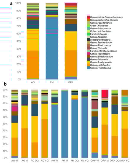 Relative abundance (%) of the bacterial genera found in the guts of bumblebee. (a) Distribution of bacterial genera within habitat; (b): distribution of bacterial genera for each caste within a habitat. AO: apple orchards, FM: forest meadows, ORF: oilseed rape fields, W: workers, M: males, OQ: ovipositing queens, YQ: young queens.