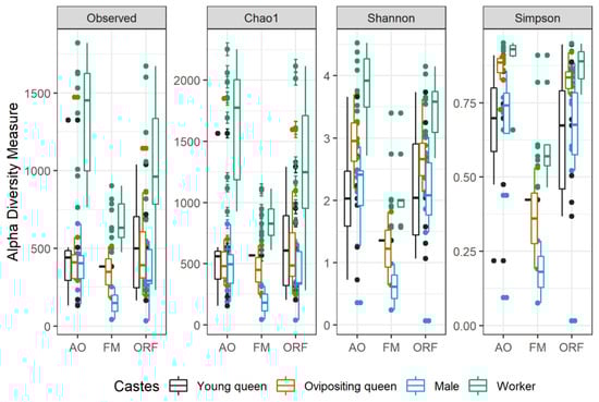 Alpha diversity indices (observed OTUs, Chao1, Shannon and Simpson diversity indices) of bumblebee castes in apple orchards (AO), forest meadows (FM), and oilseed rape fields (ORF).