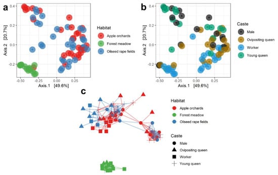 Metric multidimensional scaling (MDS/PCoA) on weighted UniFrac distances of the gut bacterial community from Bombus terrestris specimens collected from three habitat types (a) and from four castes (b). (c) Network analysis of B. terrestris gut bacterial community clustering by habitat, based on the Bray–Curtis dissimilarity matrix. Distance between different points on the plot reflects similarity level: the more similar the communities, the smaller the distance between the points.