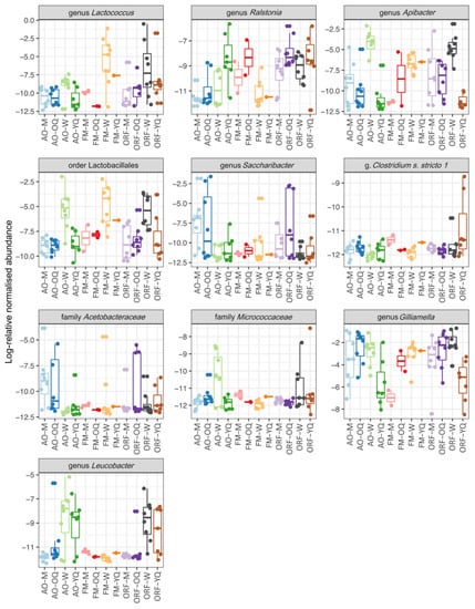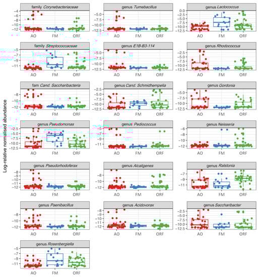 Log-relative abundance of the differentially expressed bacterial genera in the guts of Bombus terrestris collected from apple orchards (AO), forest meadows (FM), and oilseed rape fields (ORF).