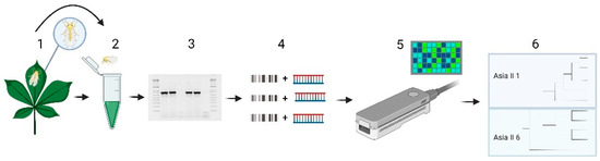 Workflow employed in this work. 1—collected sample, 2—direct PCR using the whole whitefly, 3—confirm the PCR by electrophoresis, 4—library preparation, 5—sequencing using Nanopore Tech, 6—data analysis. Created with Biorender.com (Toronto, ON, Canada).