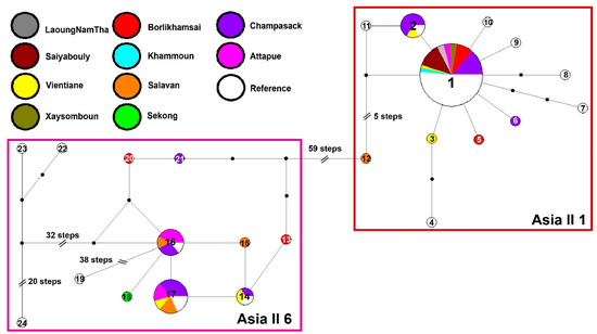 Asia II 1 haplotypes H3, H5, H12 and H6 were exclusively found in Lao PDR and among these, haplotype H12 (Salavan province) had the highest number of genetic changes. In comparison, Asia II 6 sequences (n = 22) were grouped into eight haplotypes (Table S2) where haplotype H17 was the most frequently found in Lao PDR (four provinces) and where haplotypes H13, H15, H18, H20 and H21 were exclusively found in Lao PDR.