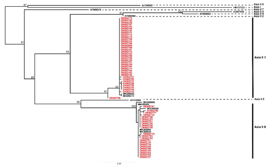 Out of 64 individuals sequenced with the MK1C (ONT) sequencer which had a coverage greater than 1000× (Table S1), 37 sequences (62.72%) corresponded to Asia II 1 while 22 sequences (37.28%) corresponded to Asia II 6. The average nucleotide frequencies found were 23.4% (A), 41.8% (T), 13.9% (C) and 23.4% (G) for 669 nucleotides aligned against available NCBI reference sequences. In total, 73 polymorphic sites (S) were identified, including two singleton sites and 71 parsimony-informative sites, important for classifying haplotypes (Table 2). In general, the haplotype diversity (h) of the entire population from Lao PDR was 0.743 and the nucleotide diversity (π) presented values of 0.04975. Tests for neutrality on the Asia II 1 data subset were significatively negative (Tajima’s D = −2.168 with p < 0.05), suggesting a recent population expansion. On the other hand, neutrality tests for Asia II 6 were close to zero (Tajima’s D = −0.644 with p > 0.05) and the sequences in this subgroup showed the highest values of average nucleotide differences (k) (Table 2).
