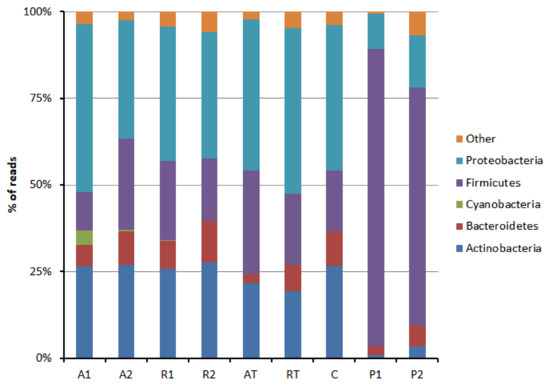 Phylum-wise distribution pattern of bacterial population in bee bread and bee pollen samples (A1 and A2 = bee breads collected from two colonies fed with oak pollen patty; R1 and R2 = bee breads collected from two colonies fed with rapeseed pollen patty; AT = bee bread collected from colony fed on oak pollen patty with restricted inflow of pollen from outside; RT = bee bread collected from colony fed on rapeseed pollen patty with restricted inflow of pollen from outside; P1 and P2 = bee pollen collected from bee hives equipped with pollen trap; C = bee bread collected from control hive).