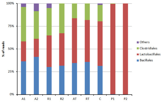Order-wise distribution of phylum Firmicutes in bee bread and bee pollen samples (A1 and A2 = bee breads collected from two colonies fed with oak pollen patty; R1 and R2 = bee breads collected from two colonies fed with rapeseed pollen patty; AT = bee bread collected from colony fed on oak pollen patty with restricted inflow of pollen from outside; RT = bee bread collected from colony fed on rapeseed pollen patty with restricted inflow of pollen from outside; P1 and P2 = bee pollen collected from bee hives equipped with pollen trap; C = bee bread collected from control hive).