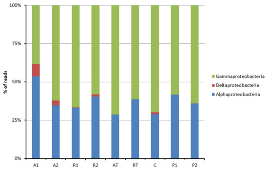 Class-wise distribution of phylum Proteobacteria in bee bread and bee pollen samples (A1 and A2 = bee breads collected from two colonies fed with oak pollen patty; R1 and R2 = bee breads collected from two colonies fed with rapeseed pollen patty; AT = bee bread collected from colony fed on oak pollen patty with restricted inflow of pollen from outside; RT = bee bread collected from colony fed on rapeseed pollen patty with restricted inflow of pollen from outside; P1 and P2 = bee pollen collected from bee hives equipped with pollen trap; C = bee bread collected from control hive).