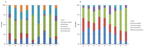 Order-wise distribution of Alpha-Proteobacteria (A) and Beta-Proteobacteria (B) in bee bread and bee pollen samples (A1 and A2 = bee breads collected from two colonies fed with oak pollen patty; R1 and R2 = bee breads collected from two colonies fed with rapeseed pollen patty; AT = bee bread collected from colony fed on oak pollen patty with restricted inflow of pollen from outside; RT = bee bread collected from colony fed on rapeseed pollen patty with restricted inflow of pollen from outside; P1 and P2 = bee pollen collected from bee hives equipped with pollen trap; C = bee bread collected from control hive).