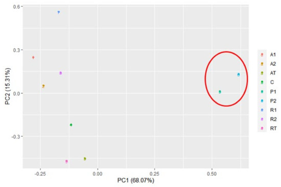 Principal Component Analysis (PCA) of bee bread and bee pollen samples based on major bacterial genera (A1 and A2 = bee breads collected from two colonies fed with oak pollen patty; R1 and R2 = bee breads collected from two colonies fed with rapeseed pollen patty; AT = bee bread collected from colony fed on oak pollen patty with restricted inflow of pollen from outside; RT = bee bread collected from colony fed on rapeseed pollen patty with restricted inflow of pollen from outside; P1 and P2 = bee pollen collected from bee hives equipped with pollen trap; C = bee bread collected from control hive). The red circle clearly indicated the clustering of bee pollen.