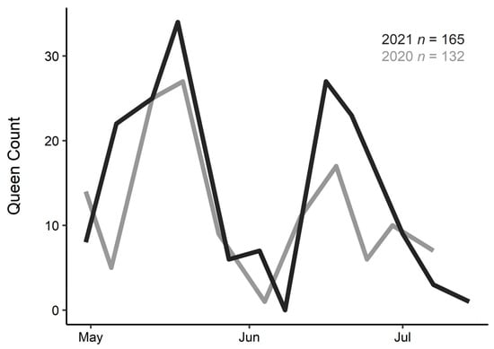 In total, we captured 132 queens between April and July of 2020 and 165 queens between April and July of 2021. Although queens were captured each week throughout the span of the 2+ month spring emergence period, they emerged in two distinct waves in both years (Figure 1). The bimodal distribution of spring emergence occurred during the same weeks each year despite large variation in weather conditions; a cold snap brought several inches of snow on 8 June 2020, whereas no late-spring cold snaps hit Laramie in 2021. Peak queen abundance was on 19 and 18 May (days 140 and 138) in 2020 and 2021, respectively, with the second peak occurring on 18 and 16 June (days 170 and 167) in 2020 and 2021.