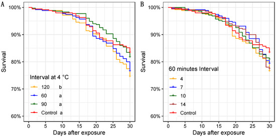 Kaplan–Meier survival curves of chilled males of Ae. aegypti after exposure to different chilling conditions for 30 days without compaction: (A) Chilling time affects male survival rates over time; (B) Temperature effect after 60 min of exposure on male survival rates over time. Different letters represent significant differences among the treatments for the time interval and the temperature (Log-rank test; p < 0.05 for (A) and p = 0.230 for (B)). All time intervals and all temperatures used mosquitoes from the same batch and shared one control group. T = 27 ± 1 °C; RH = 60 ± 10%, photoperiod = L12:D12.