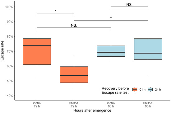 Aedes mosquito male escape rates after chilling at 4 °C for 60 min without compaction. Except for the controls (which only represent hours after emergence), the light blue group (96 h) was exposed to chilling at the same time as the 72 h, but they had 24 h to recover prior to the escape rate test. Significance values goes as ‘*’ < 0.05, ‘NS’ < 1. The boxplot shows the median and upper and lower quartiles.
