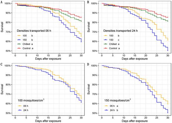 Kaplan–Meier survival curves of compacted and control males over 30 days: (A) Chilling and compacting effect for 6 h; (B) Chilling and compacting effect for 24 h; (C) Shipment using 100 males/cm3 after knockout (Log-rank test; p < 0.12); (D) Shipment using 150 males/cm3 after knockout. Differences between treatments in (A,B,D) are represented by different letters (Log-rank test; p < 0.05) T = 27 ± 1 °C; RH = 60 ± 10%, photoperiod = L12:D12.